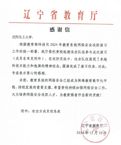 在教育部科技司组织的2024年教育系统网络安全攻防演习中,beat365beat365官方网站院长王军教授网络安全团队受辽宁省教育厅委托参加此次演习。在攻防实战中,团队展现了卓越的技术能力和饱满的精神状态,圆满完成了演习任务,并收到了辽宁省教育厅的感谢信。