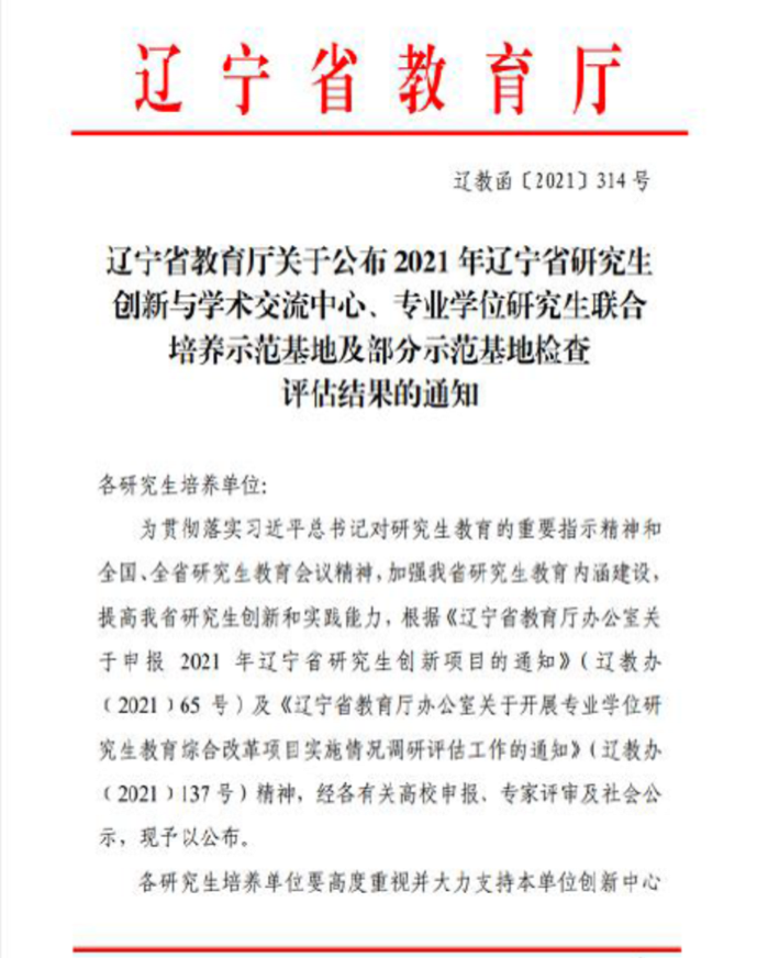 根据《辽宁省教育厅办公室关于申报2021年辽宁省研究生创新项目的通知》(辽教办( 2021)65号)及《辽宁省教育厅办公室关于开展专业学位研究生教育综合改革项目实施情况调研评估工作的通知》(辽教办2021 137号)精神,我院与辽宁省视讯技术有限公司建立的硕士研究生联合培养基地申报了2021年辽宁省专业学位研究生联合培养示范基地。经省教育厅的严格筛选和考察,本基地成功获批示范基地。